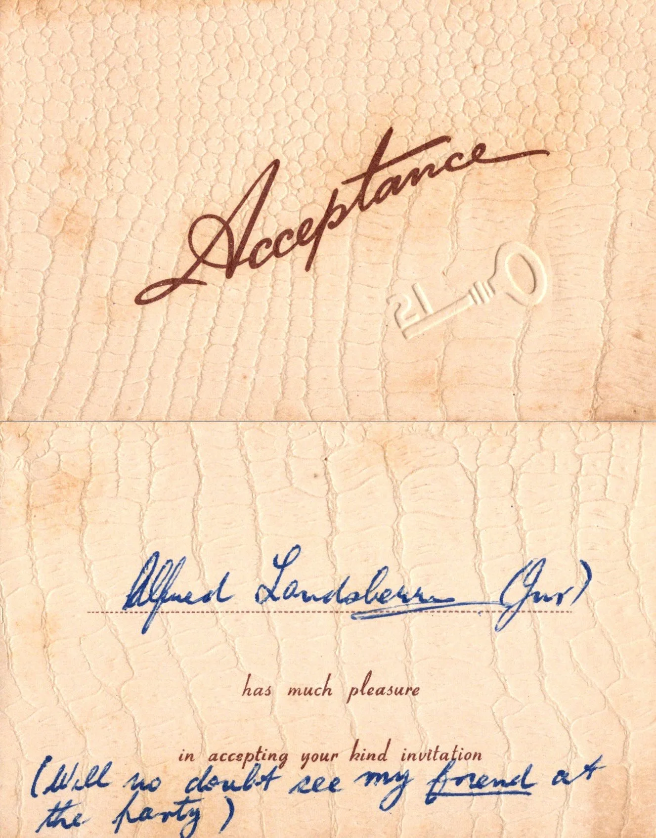 In the meantime, back in 1949, it’s Mum’s 21st birthday - the invitations go out, and the acceptances flood in, including this one from my Dad, where he writes that he “will no doubt see my friend at the party”, and I think we all know what THAT means. Nudge, nudge…wink, wink. Actually, it’s 1949 and the 21st birthday for a strict Catholic girl from the country, so it probably just means he hopes to see his friend…that’s about it.