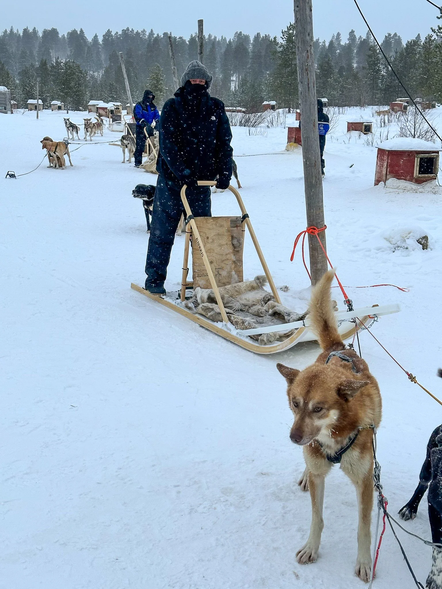 So, 12:30pm comes and off we go to dog sledding, or ‘mushing’ as it’s known. When we arrived at the 108 strong dog kennels, we were given some thorough training. “Here the sled is. Dis is da mat brake for the slow stop and dis is da spike brake for da quick stop. Here - dis is da sled for you.”